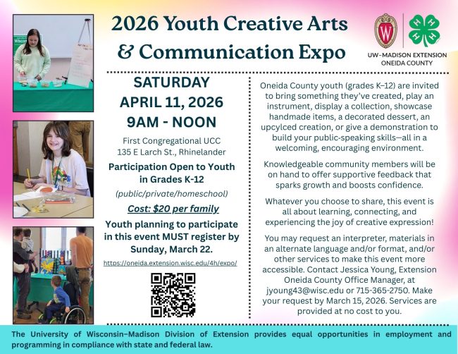 You may request an interpreter, materials in an alternate language and/or format, and/or other services to make this event more accessible. Contact Jessica Young, Extension Oneida County Office Manager, at jyoung43@wisc.edu or 715-365-2750. Make your request by March 15, 2026. Services are provided at no cost to you.