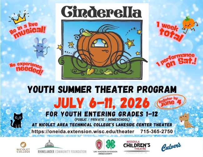 Oneida County 4-H is partnering with the Missoula Children’s Theatre, to present a one-week, live performing arts opportunity for youth entering grades 1-12 in Oneida County (public/private/homeschool). Two professional actor/directors will come to Rhinelander for one week to direct a full-scale musical starring up to 60 local school-aged children.